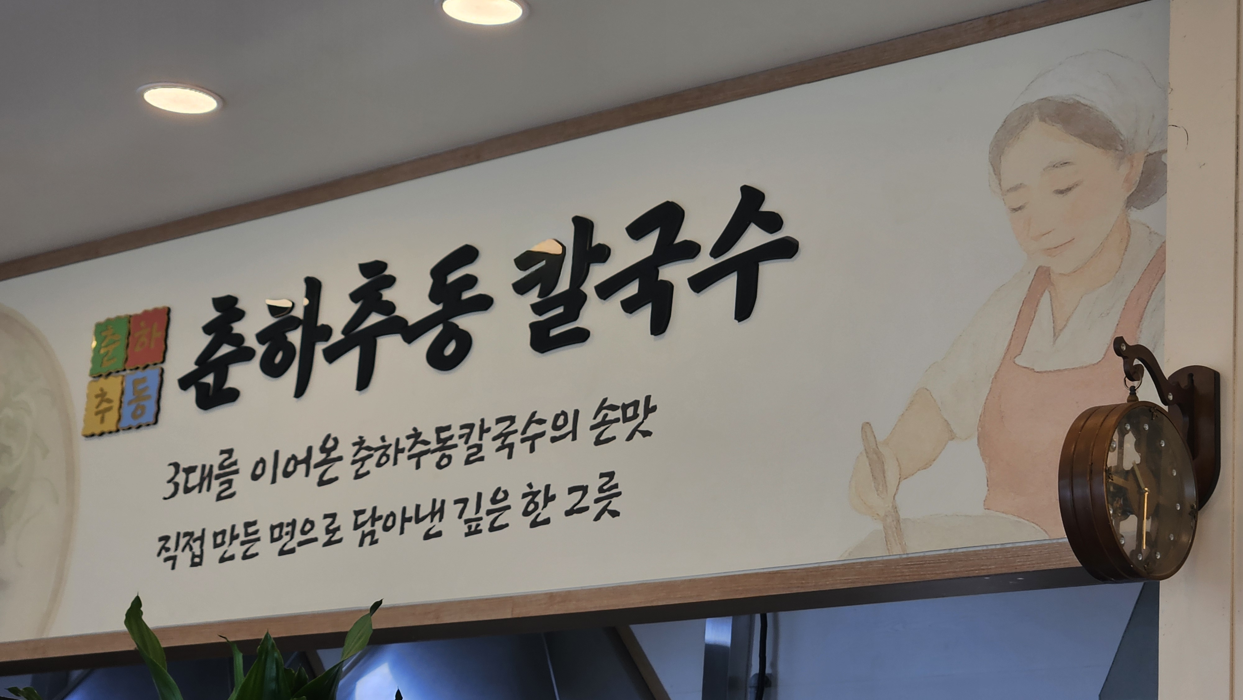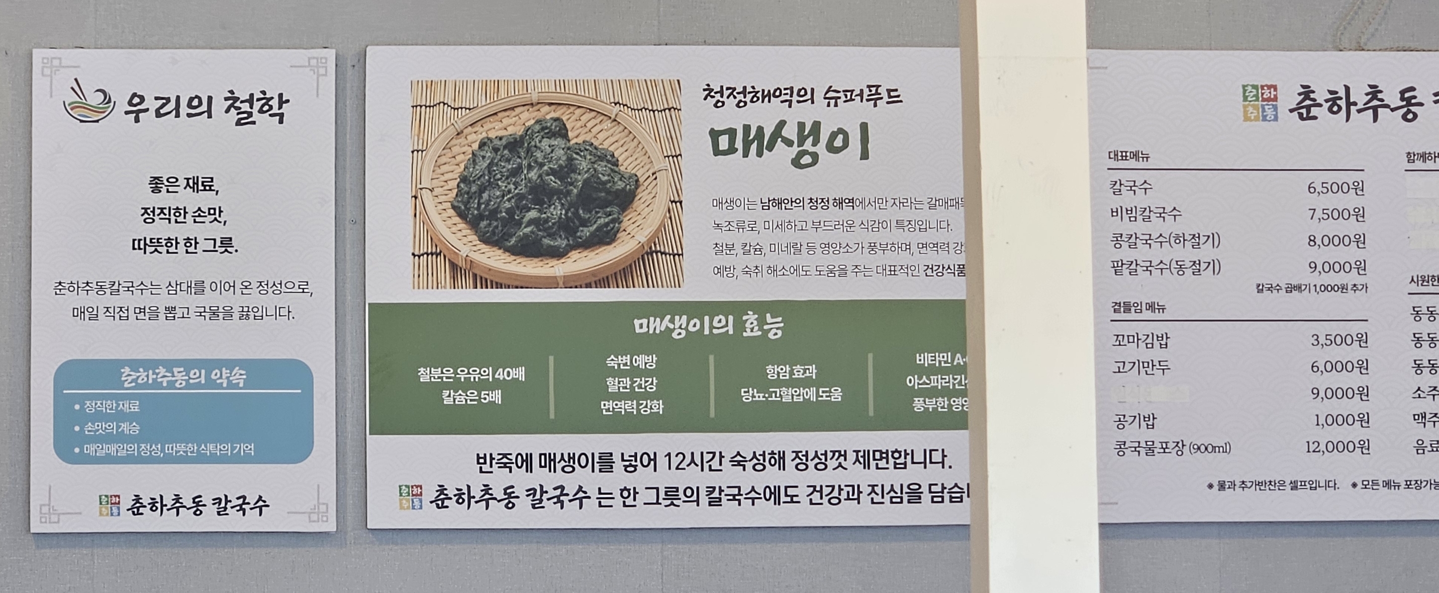 오늘 방문한 곳은 춘하추동칼국수. 가게 벽면에는 “좋은 재료, 정직한 손맛, 따뜻한 한 그릇”이라는 문구가 적혀 있었고, 매일 직접 면을 뽑아 국물을 끓인다는 설명이 눈에 들어왔습니다. 실제로 면의 탄력이 살아 있고 콩국물은 너무 묽지 않게 잘 갈려 있어 한입마다 고소함이 진하게 느껴졌습니다. 김치와의 조합도 깔끔해서 금방 한 그릇을 비웠습니다.
