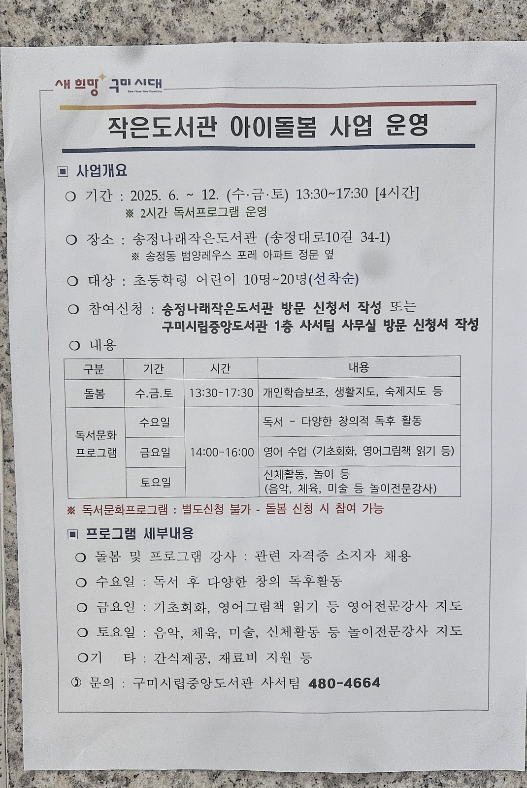신청: 송정나래작은도서관 또는 구미중앙도서관 방문