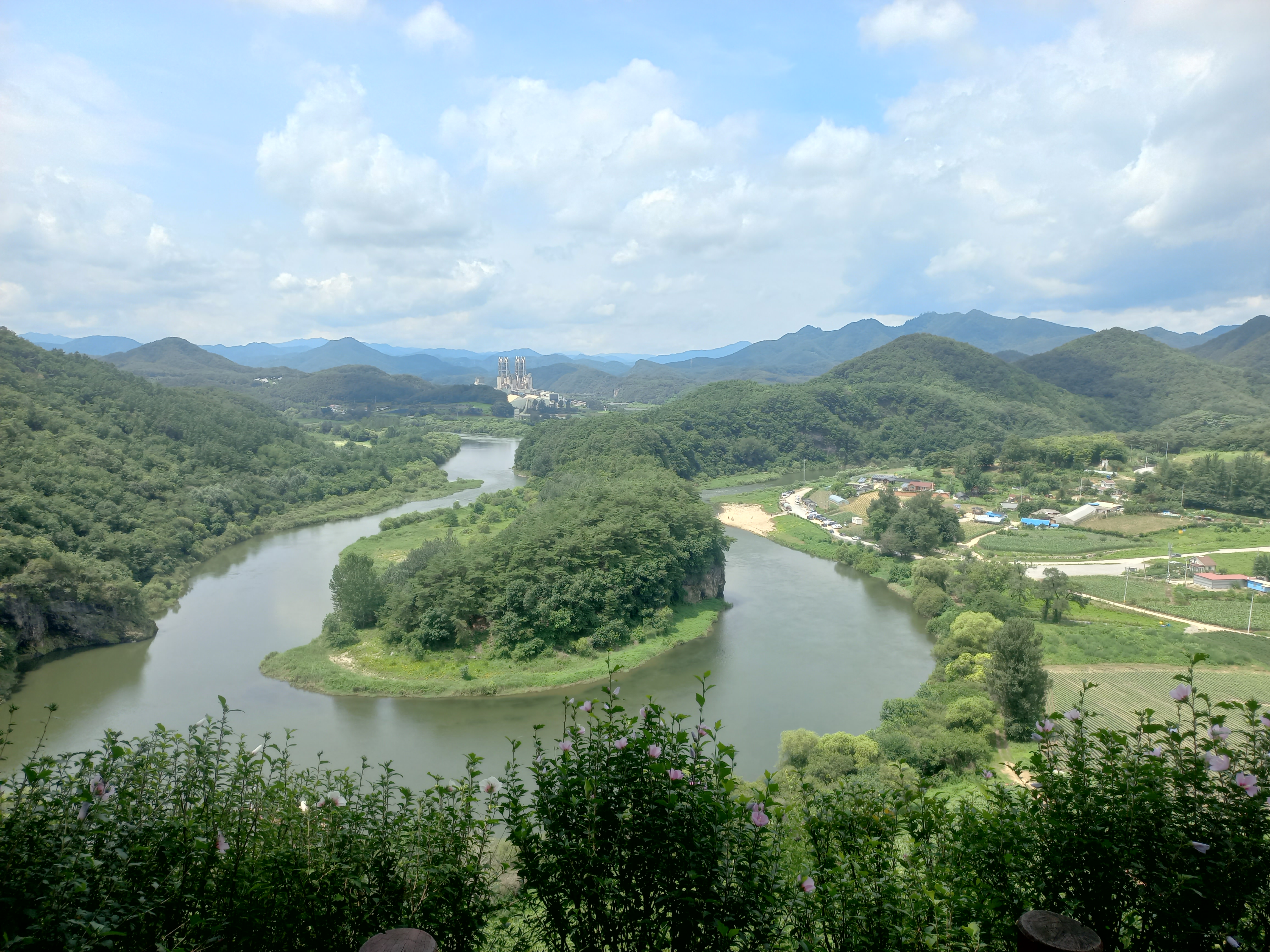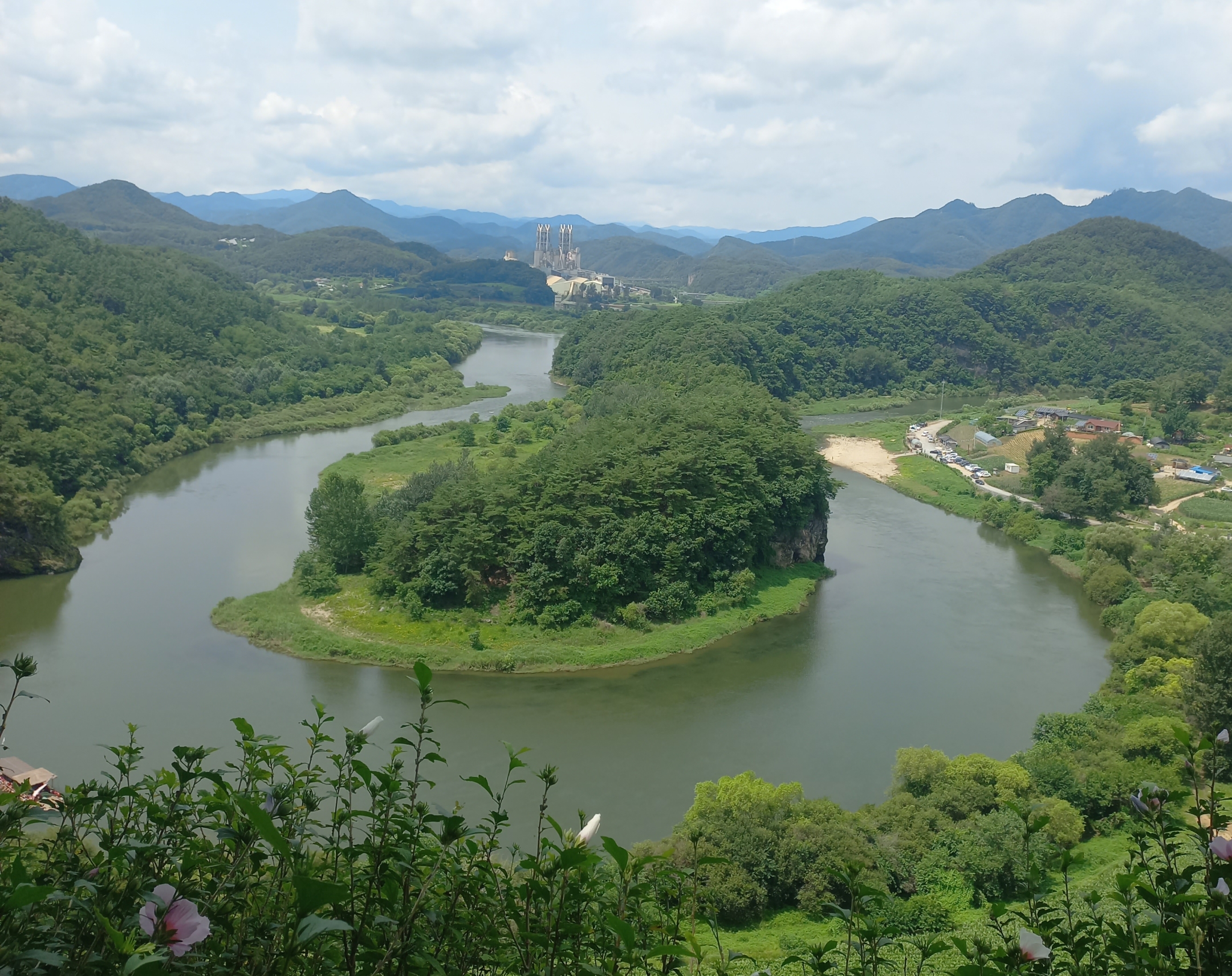 이 지형의 가장 큰 특징은 강물이 산을 휘감으며 흐르면서 만들어낸 자연 곡류 현상입니다. 오랜 세월 동안 물살이 지층을 깎아내고 퇴적물을 쌓아올리며 지금과 같은 모습이 형성된 것입니다. 가운데 자리한 땅덩이는 남한을, 주변을 휘돌아 나가는 강물은 삼면의 바다를 상징하는 듯한 모양을 하고 있어 많은 이들이 “육지 속의 작은 대한민국”이라고 부릅니다.