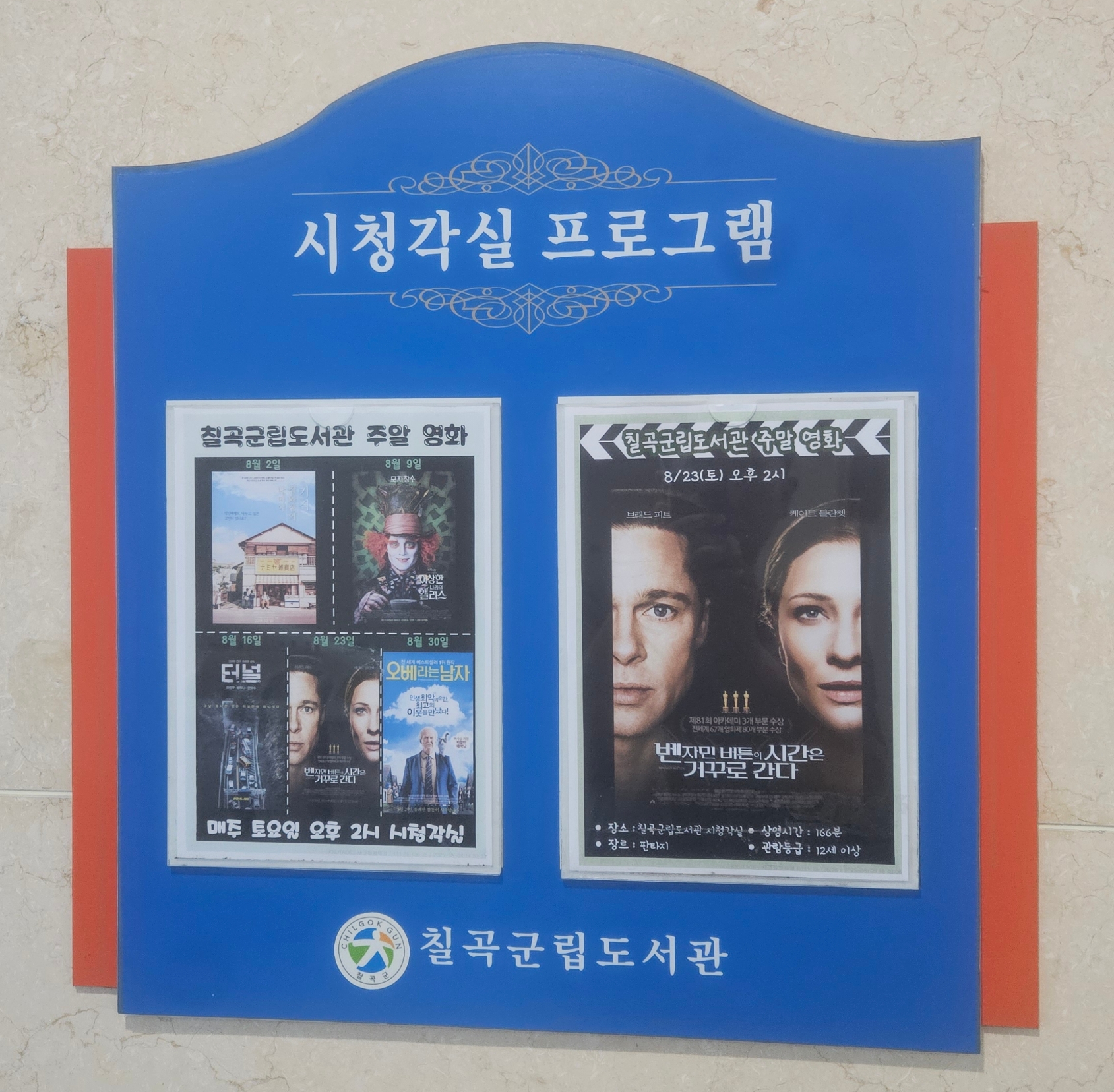 칠곡군립도서관에서는 매주 토요일 오후 2시, 시청각실에서 영화를 무료로 상영합니다.