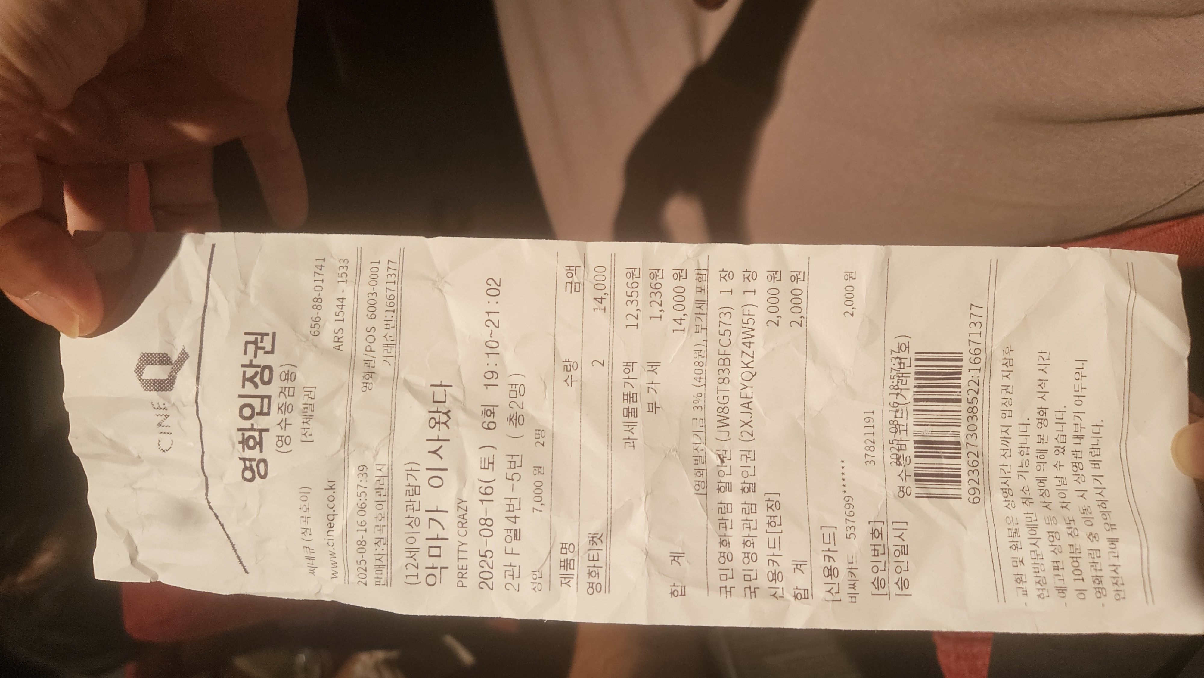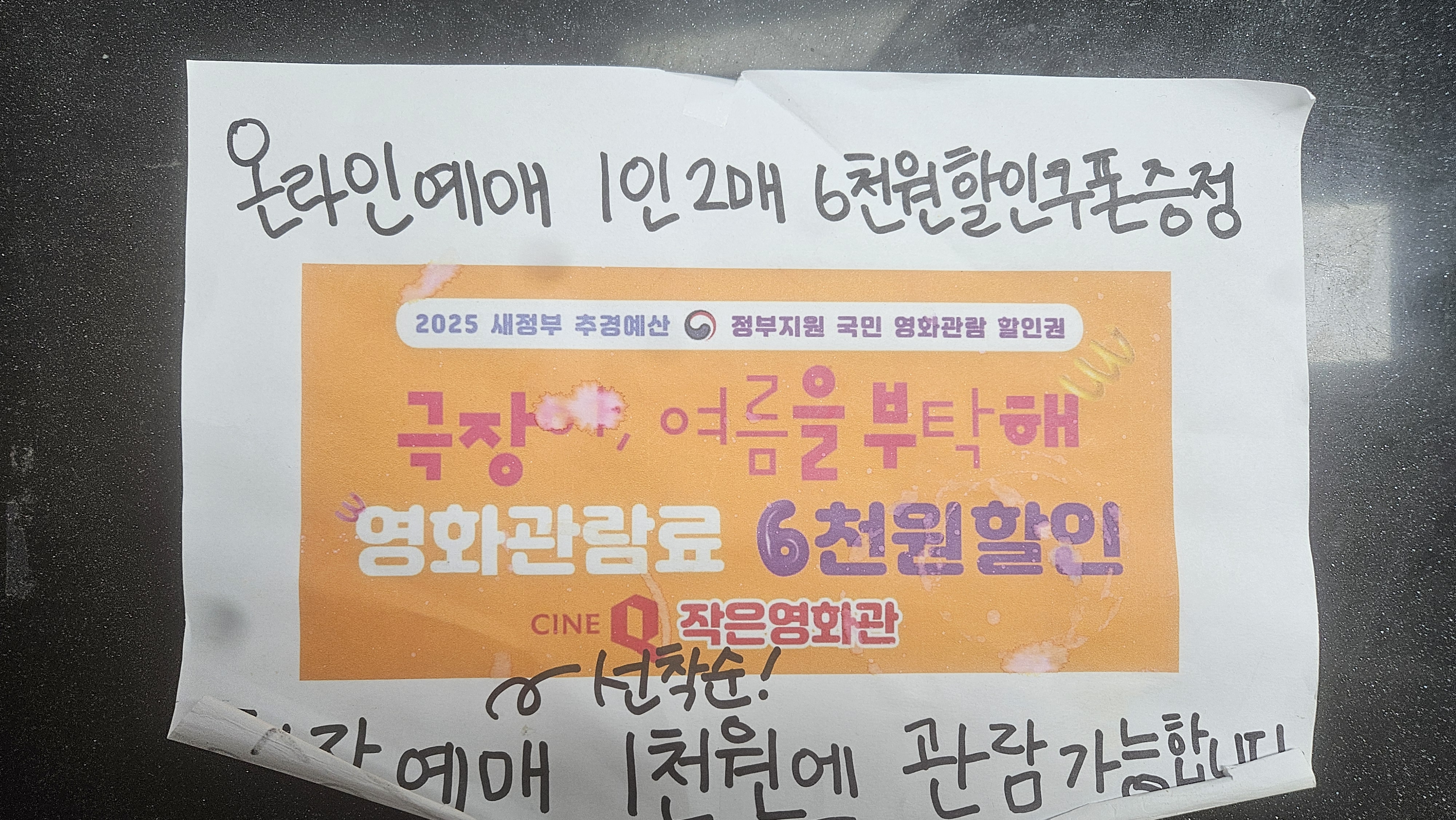 원래 영화관람권 가격은 **7,000원**인데, 정부 지원 국민영화관람 할인권을 적용하니 **6,000원이 할인**되어 단돈 **1,000원**에 영화를 볼 수 있었습니다.